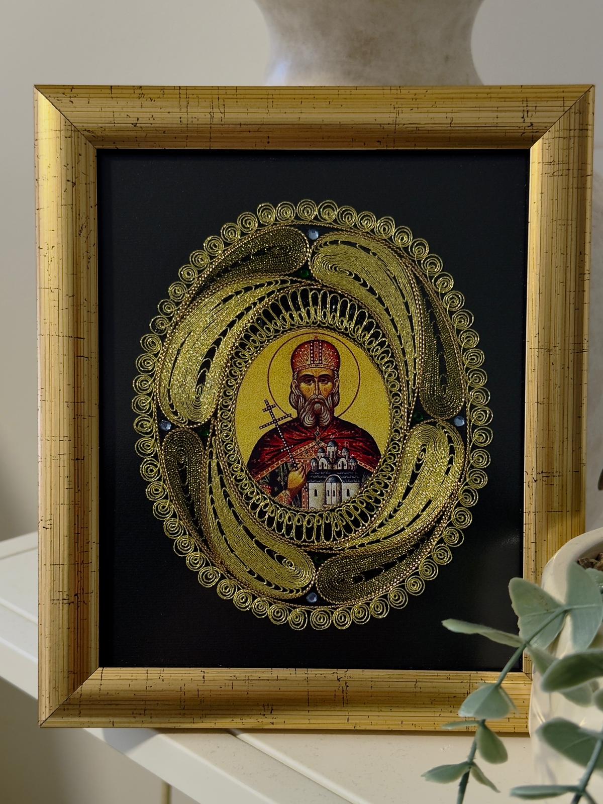 Ručni rad od srmenog konca, izrađena sa pažnjom i poštovanjem prema pravoslavnoj tradiciji. Namenjena za dom, molitveni kutak ili kao poseban poklon.