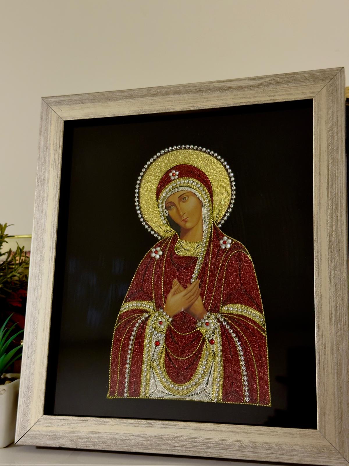 Ikona Presvete Bogorodice izrađena od srmenog konca nosi duh tišine, vere i unutrašnjeg mira. Lik Presvete Bogorodice simbol je bezuslovne majčinske ljubavi, nade i zaštite, kao i večne brige nad domom i porodicom.