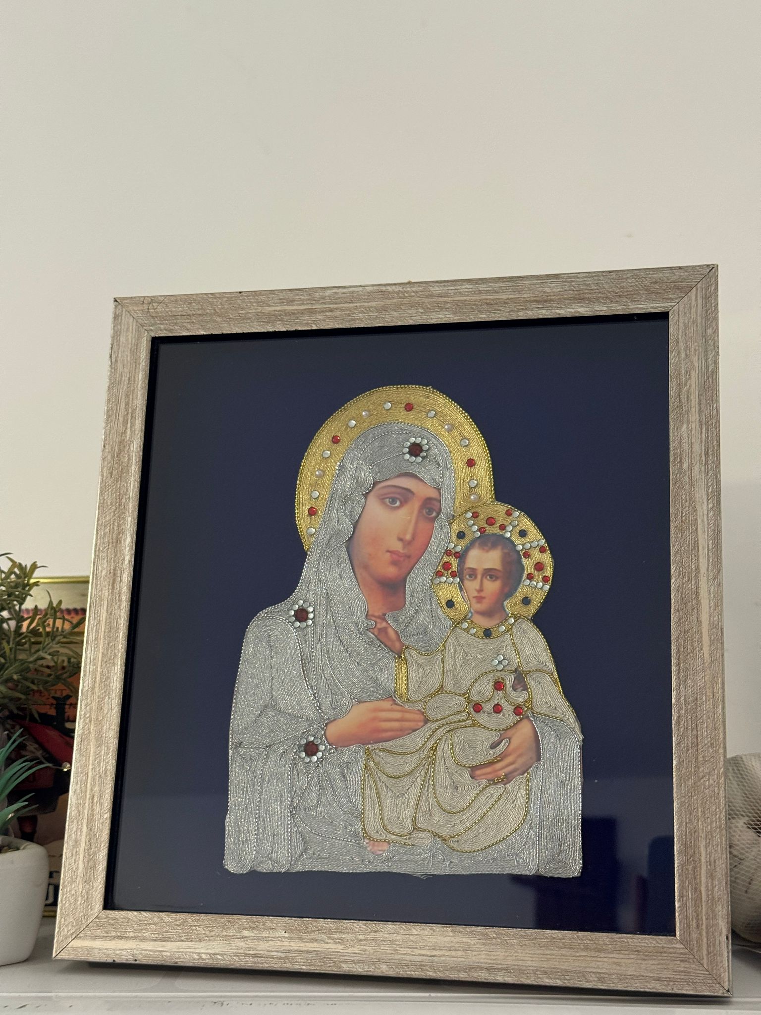 Ikona Presvete Bogorodice izrađena od srmenog konca nosi duh tišine, vere i unutrašnjeg mira. Lik Presvete Bogorodice simbol je bezuslovne majčinske ljubavi, nade i zaštite, kao i večne brige nad domom i porodicom.