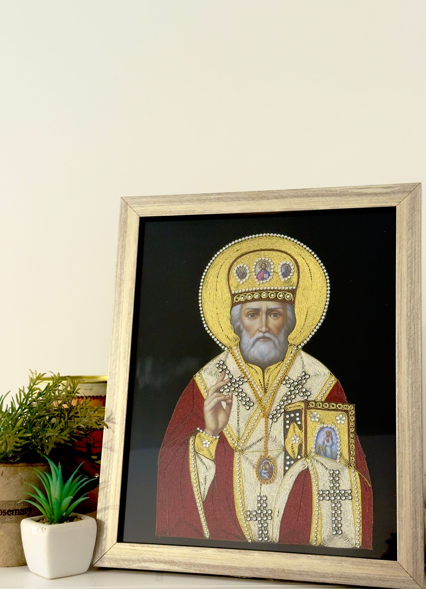 Ikona Svetog Nikole izrađena od srmenog konca odiše toplinom i svečanim sjajem, naglašavajući duhovnu snagu i trajnu vrednost ovog svetitelja. Sveti Nikola, poznat kao zaštitnik porodice, dece, putnika i siromašnih, simbol je milosrđa, pravednosti i nesebične pomoći.
