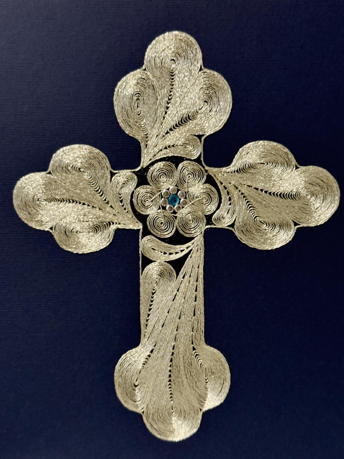Ekskluzivan ručni rad izrađen od srmenog konca, sa posebnom pažnjom prema svakom detalju i dubokim poštovanjem pravoslavne tradicije. Bogata tekstura i diskretan sjaj daju krstu dostojanstven i svečan izgled, naglašavajući njegovu duhovnu simboliku.